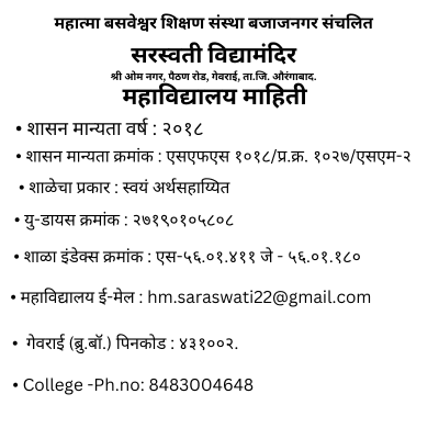 Saraswati Vidyamandir, located Padalkar Educational Campus, Georai, Paithan Road, Chh.sambhajinagar - 431002, is a self-financed institution officially recognized by the Government of Maharashtra since 2018. The college operates under the Mahatma Basaveshwar Shikshan Sanstha, with approval from the Maharashtra State Board (Approval No. एसएफएस २०१८/प्र.क्र. १०७०/एसएफएस-२). It holds a unique DISE code, examination center code, and is committed to maintaining high academic standards